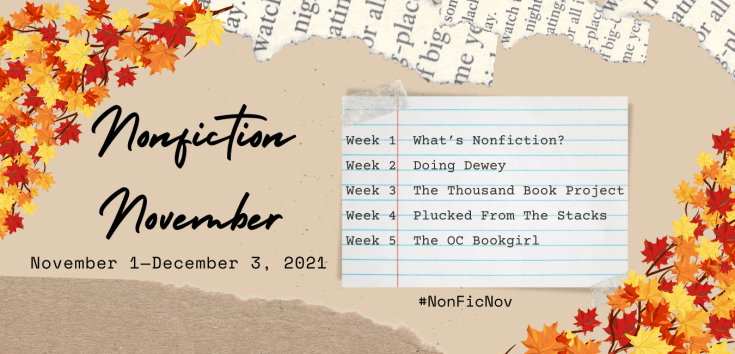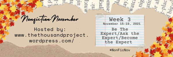 Week 3: (November 15-19) – Be The Expert/ Ask the Expert/ Become the Expert with Veronica at The Thousand Book Project: Three ways to join in this week! You can either share 3 or more books on a single topic that you have read and can recommend (be the expert), you can put the call out for good nonfiction on a specific topic that you have been dying to read (ask the expert), or you can create your own list of books on a topic that you’d like to read (become the expert).